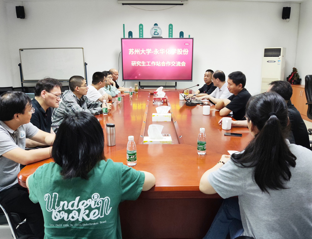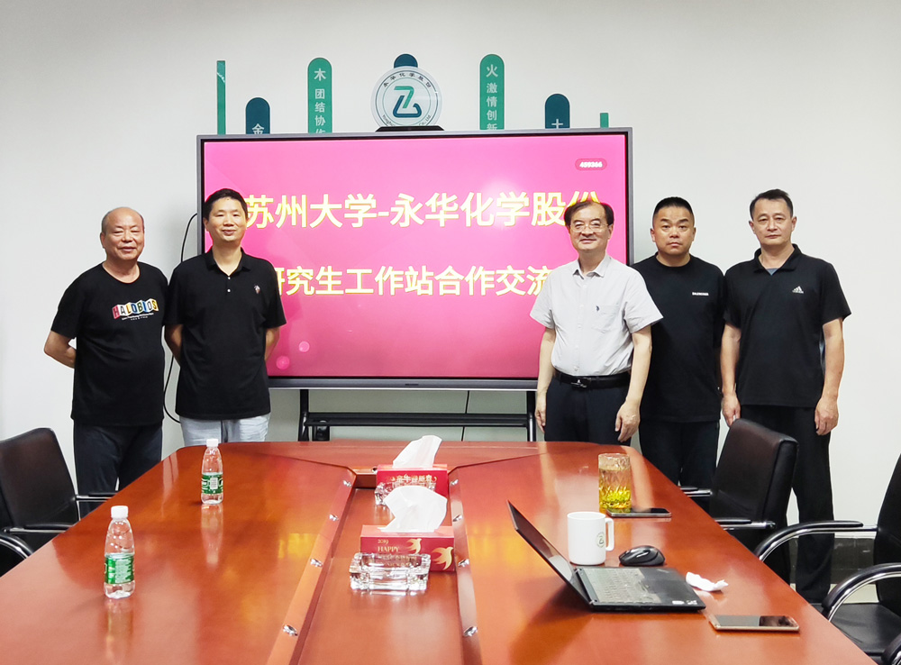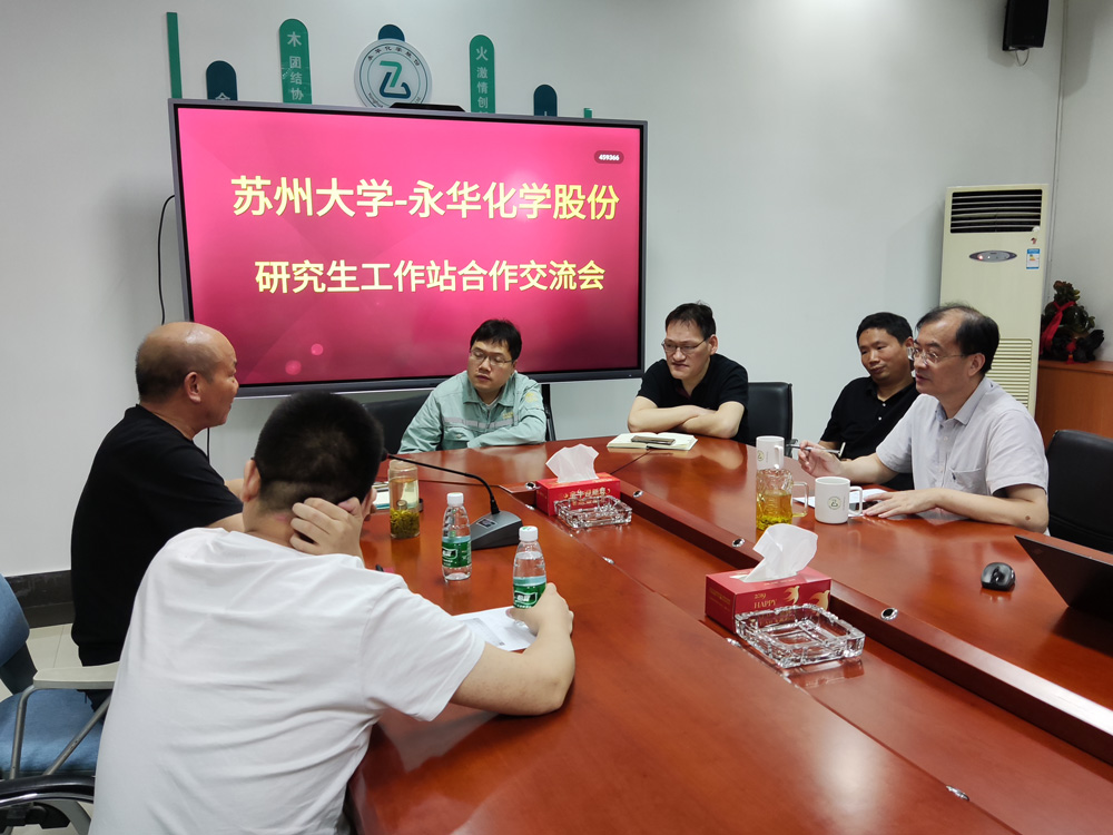 近(jìn)日,苏州大学—永华化学股份研究生工作站合作交(jiāo)流会在永华化学股份有限公司会议室举行。苏州大学校党委(wěi)常委(wěi)、统战部部长黄志斌教授、化学与材料部赵应声教授、检测中心主任陆新华,永华化学股份总经理顾(gù)学峰(fēng)、常务副总经理戴惠明(míng)等出席会(huì)议。