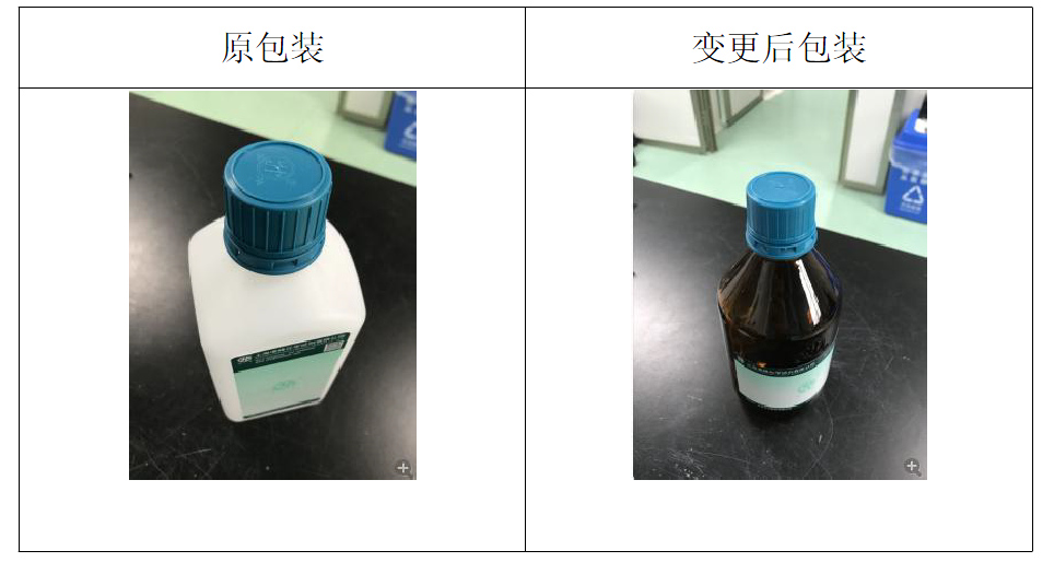 98%甲酸原为500mL 塑料瓶包装含透(tòu)气盖(gài),由于甲酸能缓慢透(tòu)过气孔逸出导致包(bāo)装箱、报告单腐蚀(shí),影响产品外观,经综合考虑,变更为500mL 棕色(sè)玻璃(lí)瓶包装(含内(nèi)塞)。