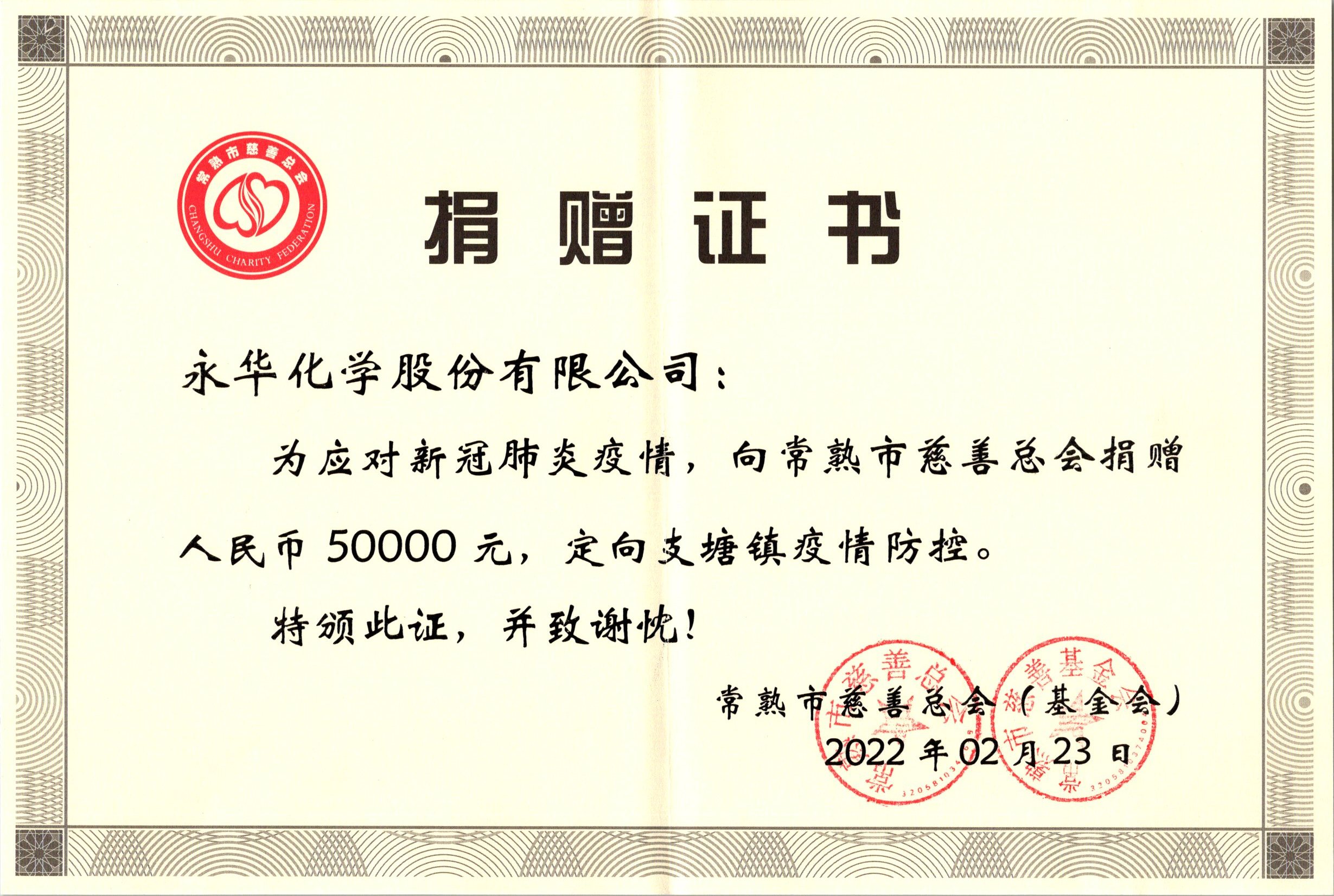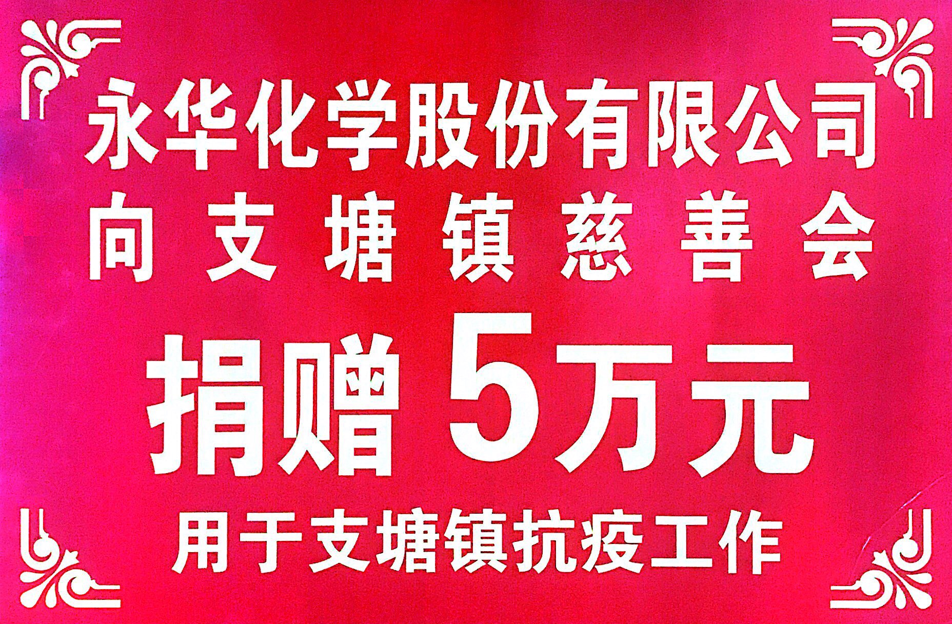 疫情无情,人(rén)间有情。针(zhēn)对突袭的新冠肺(fèi)炎疫情,作为社会团体的一员,今年2月永华化(huà)学主动向常熟市慈善总会捐赠5万元,定向用于支塘疫情防控工作。