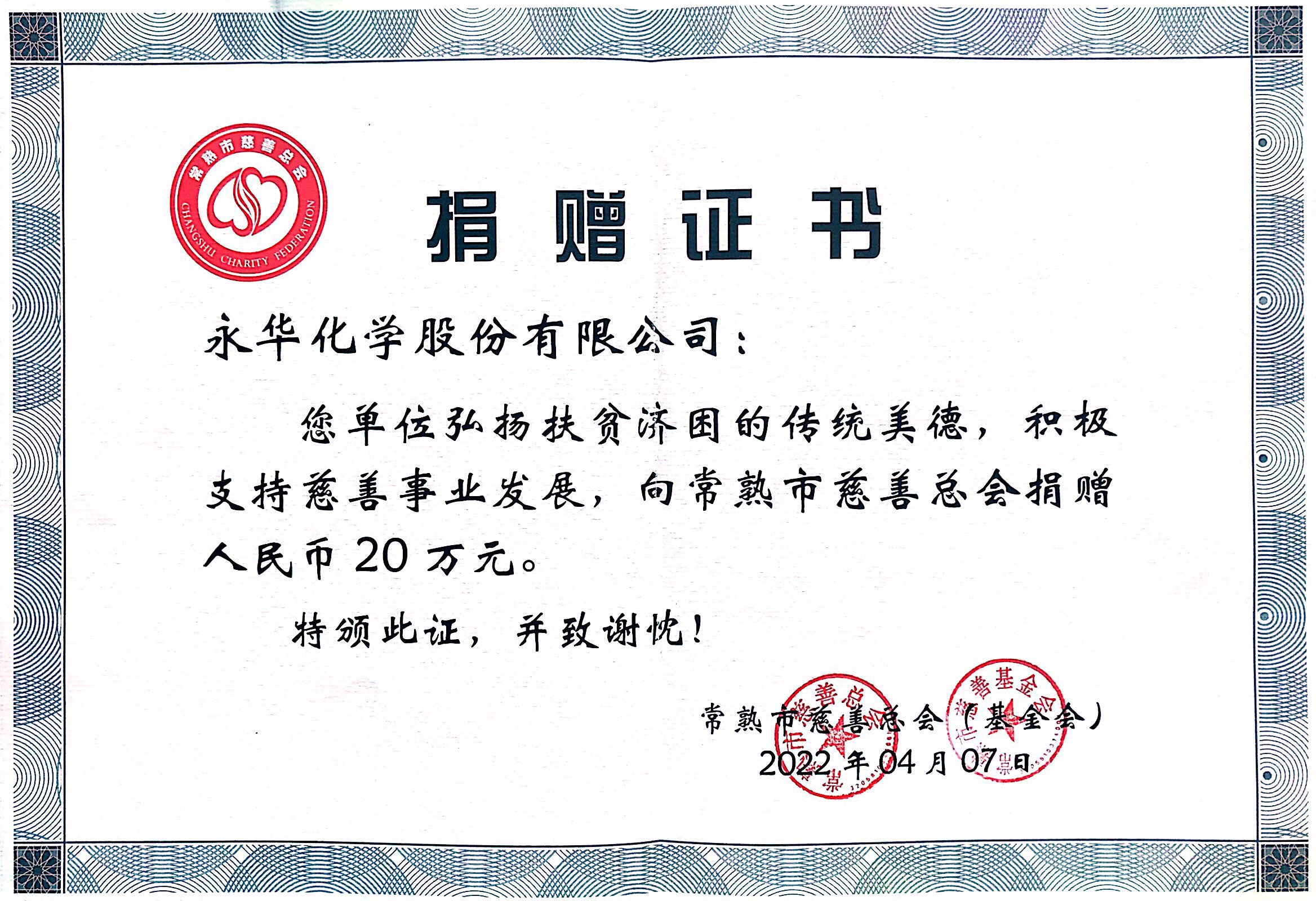 4月,为响应建设“善美常熟 小城大爱”,围(wéi)绕(rào)乡村振兴、共(gòng)同富裕,进一步在全社会弘扬乐善好施、扶贫济困的传统美德,永华化学向常熟市(shì)慈善总会捐赠(zèng)人民币20万(wàn)元(yuán)。捐赠是(shì)真诚的(de),关爱是无(wú)价的,授人玫瑰,手有余香,奉献爱心(xīn),收获希望。